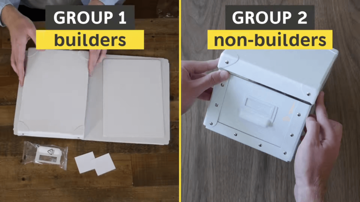 მარცხნივ: შესანახი კოლოფი, როგორც ერთ – ერთი ასაწყობი კომპონენტი. მარჯვნივ:  იგივე კოლოფი აწყობილ მდგომარეობაში. © Youtube: The IKEA Effect: labor, love, and storage boxes